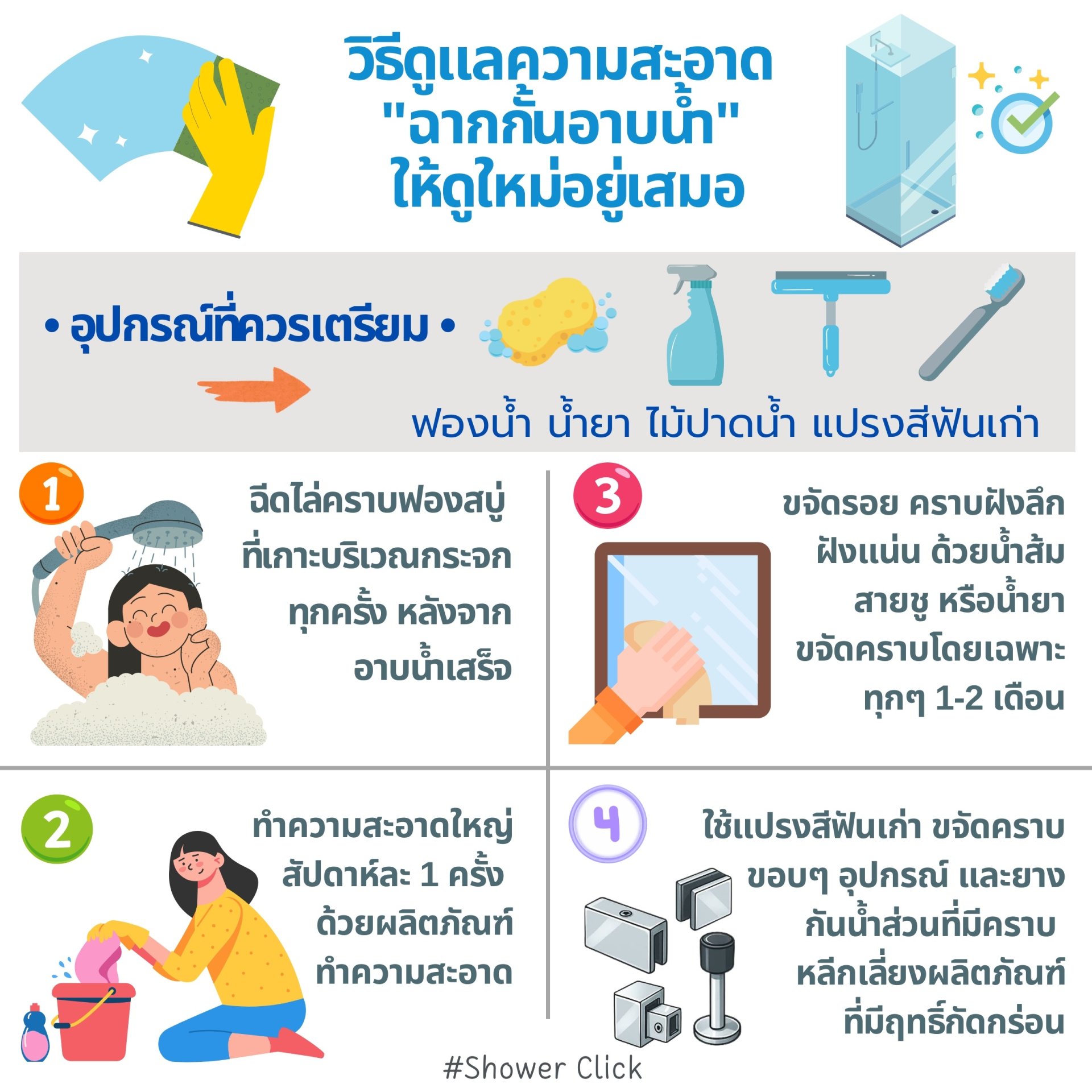 1. ทำความสะอาด หลังจากอาบน้ำทุกครั้ง ใช้ฝักบัว ฉีดชำระคราบฟองสบู่ แชมพู บริเวณกระจก ผนัง และพื้นทุกครั้ง